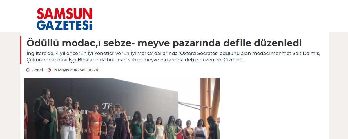 İngiltere’de, 4 yıl önce ’En İyi Yönetici’ ve ’En İyi Marka’ dallarında ’Oxford Socrates’ ödülünü alan modacı Mehmet Sait Dalmış, Çukurambar’daki İşçi Blokları’nda bulunan sebze-meyve pazarında defile düzenledi. Cizre’de başlayan hayatını İngiltere’ye taşıyan modacı Mehmet Sait Dalmış, Çukurambar’daki İşçi Blokları’nda bulunan sebze- meyve pazarında düzenlediği defile ile dikkatleri çekti. İHA muhabirinin sorularını cevaplandıran Dalmış, Koleksiyonunu yaklaşık 3 ayda tamamladığını belirterek”Son bir ayda çok fazla yoğunluğum vardı.