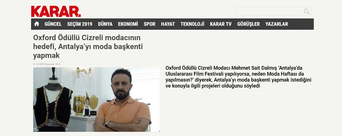 Başta ünlü aktör Mike Mitchell’in eşi Denise Mitchell olmak üzere birçok tanınan sanatçıların tasarımcılığını yapan Oxford Ödüllü Cizreli modacı Mehmet Sait Dalmış, 55. Uluslararası Antalya Film Festivali’ne katıldı. Dalmış, “’Antalya’da Uluslararası Film Festivali yapılıyorsa, neden Moda Haftası da yapılmasın?’ diyerek konuyla ilgili proje fikri olduğunu söyledi. Birçok yerli ve yabancı ünlü oyuncuların modacılığını yapan Dalmış, Türkiye’nin tekstil sektöründe Çin ile yarışırken, moda sektöründe Avrupa’nın çok gerisinde kaldığına dikkat çekti. Dalmış, “Öncelikle şunu belirtmek istiyorum; Dünyada iki piyasa var, Çin piyasası ve tekstil. Dünya tekstil başkentiyiz, ama moda başkenti değiliz. Benim hedeflerimin arasında Türkiye’yi moda başkenti yapmak” dedi