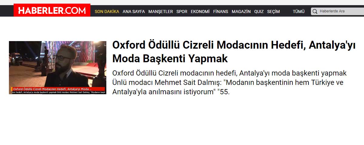 Başta ünlü aktör Mike Mitchell’in eşi Denise Mitchell olmak üzere birçok tanınan sanatçıların tasarımcılığını yapan Oxford Ödüllü Cizreli modacı Mehmet Sait Dalmış, 55. Uluslararası Antalya Film Festivali’ne katıldı. Dalmış, “‘Antalya’ da Uluslararası Film Festivali yapılıyorsa, neden Moda Haftası da yapılmasın?’ diyerek konuyla ilgili proje fikri olduğunu ileri sürdü. Birçok yerli ve yabancı ünlü oyuncuların modacılığını yapan Dalmış, Türkiye’nin tekstil sektöründe Çin ile yarışırken, moda sektöründe Avrupa‘nın çok gerisinde kaldığına dikkat çekti. Dalmış, “Öncelikle şunu belirtmek istiyorum; Dünyada iki piyasa var, Çin piyasası ve tekstil. Dünya tekstil başkentiyiz, ama moda başkenti değiliz. Benim hedeflerimin arasında Türkiye’yi moda başkenti yapmak” dedi.
