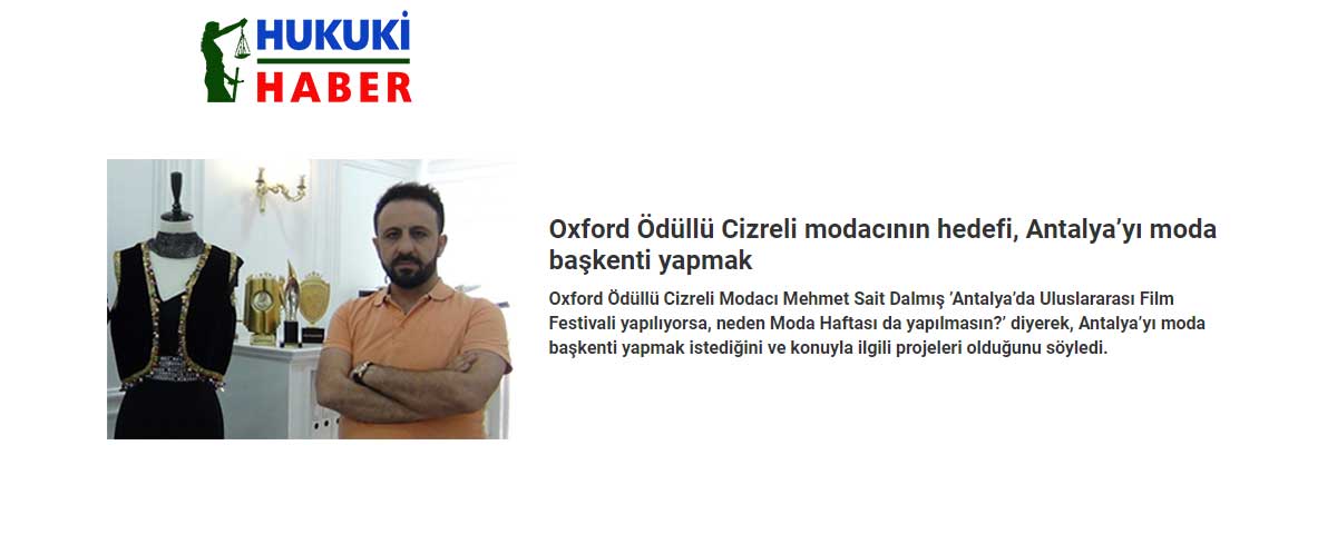 Oxford Ödüllü Cizreli Modacı Mehmet Sait Dalmış ’Antalya’da Uluslararası Film Festivali yapılıyorsa, neden Moda Haftası da yapılmasın?’ diyerek, Antalya’yı moda başkenti yapmak istediğini ve konuyla ilgili projeleri olduğunu söyledi.
