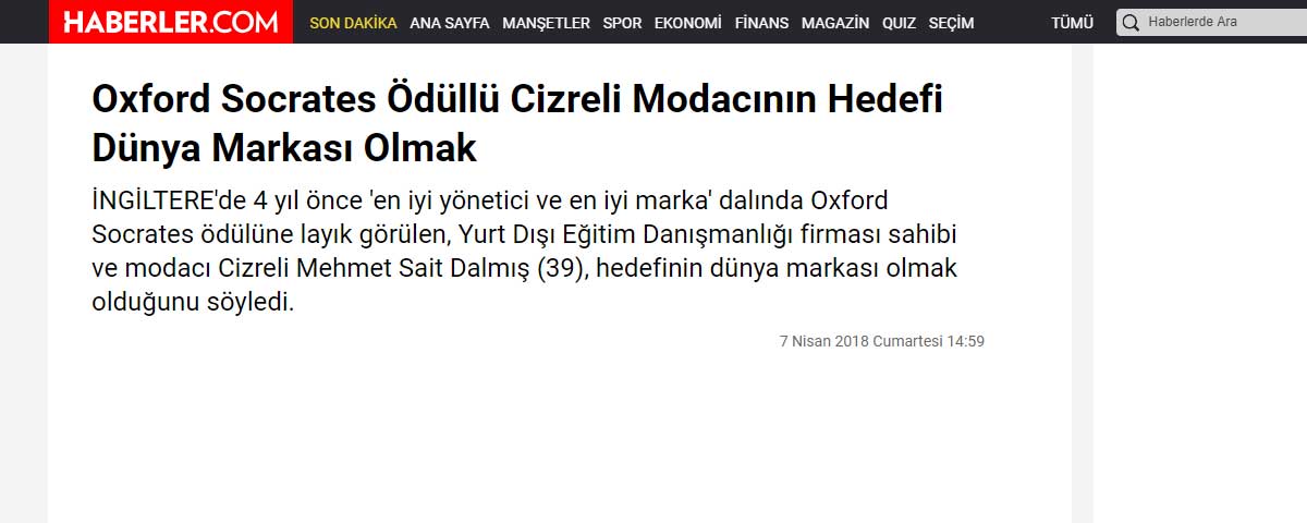 İNGİLTERE‘de 4 yıl önce ‘en iyi yönetici ve en iyi marka’ dalında Oxford Socrates ödülüne layık görülen, Yurt Dışı Eğitim Danışmanlığı firması sahibi ve modacı Cizreli Mehmet Sait Dalmış (39), hedefinin dünya markası olmak olduğunu söyledi.