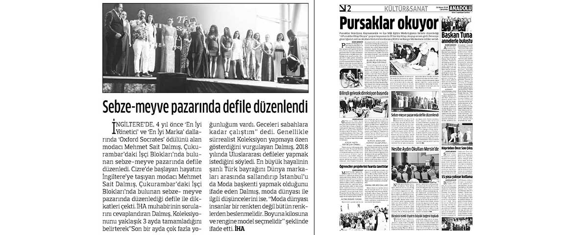 Sebze-meyve pazarında defile düzenlendi TNGILTERE’DE, 4 yıl önce ‘En iyi 1 Yönetici’ ve ‘En İyi Marka’ dallarında ‘Oxford Socrates’ ödülünü alan modacı Mehmet Sait Dalmış, Çukurambar’daki İşçi Blokları’nda bulunan sebze-meyve pazarında defile düzenledi. Cizre’de başlayan hayatını İngiltere’ye taşıyan modacı Mehmet Sait Dalmış, Çukurambar’daki İşçi Blokları’nda bulunan sebze- meyve pazarında düzenlediği defile ile dikkatleri çekti. İHA muhabirinin sorularını cevaplandıran Dalmış, Koleksiyonunu yaklaşık 3 ayda tamamladığını belirterek”Son bir ayda çok fazla yoğunluğum vardı. Geceleri sabahlara kadar çalıştım” dedi. Genellikle sürrealist Koleksiyon yapmaya özen gösterdiğini vurgulayan Dalmış, 2018 yılında Uluslararası defileler yapmak istediğini söyledi. En büyük hayalinin şanlı Türk bayrağını Dünya markaları arasında sallandırıp İstanbul’u da Moda başkenti yapmak olduğunu ifade eden Dalmış, moda dünyası ile ilgili düşüncelerini ise, “Moda dünyası insanlar bir renkten değil bütün renklerden beslenmelidir. Boyuna kilosuna ve rengine model seçmelidir” şeklinde ifade etti.